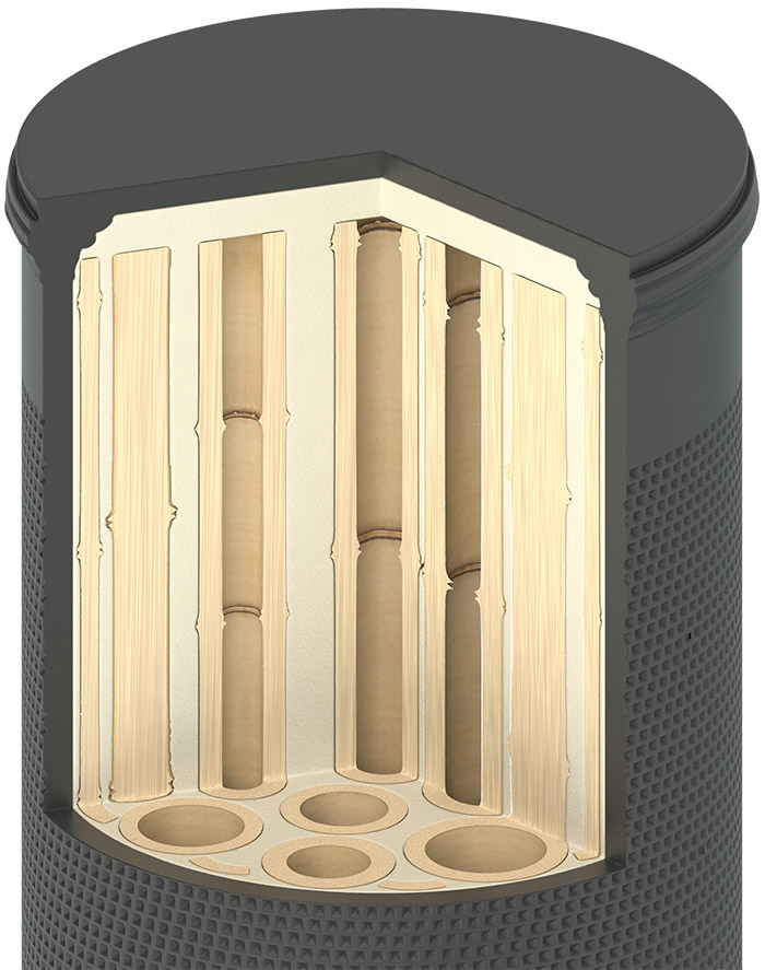 The inside of the pole is made of solid high density bamboo rods along the entire length, which are molded into a solid element with a special reinforcing polyurethane foam which, together, provides high strength and elasticity, resistance to increased compression and traction and impressive torsional strength.